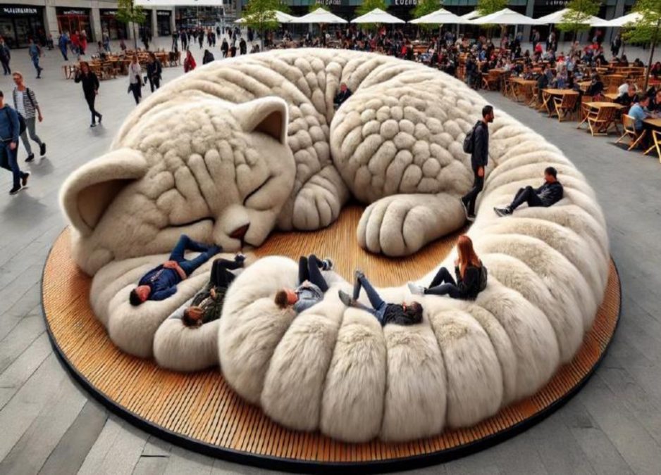 A obra “Círculo de Paz” é uma instalação artística que combina arte, design urbano e afeto em um gesto simples: criar um espaço de acolhimento coletivo inspirado na forma de um gato em repouso. A escultura representa um enorme gato adormecido, transformado em mobiliário público lúdico, que convida o público a deitar, sentar e relaxar em sua estrutura macia como um gato felpudo.